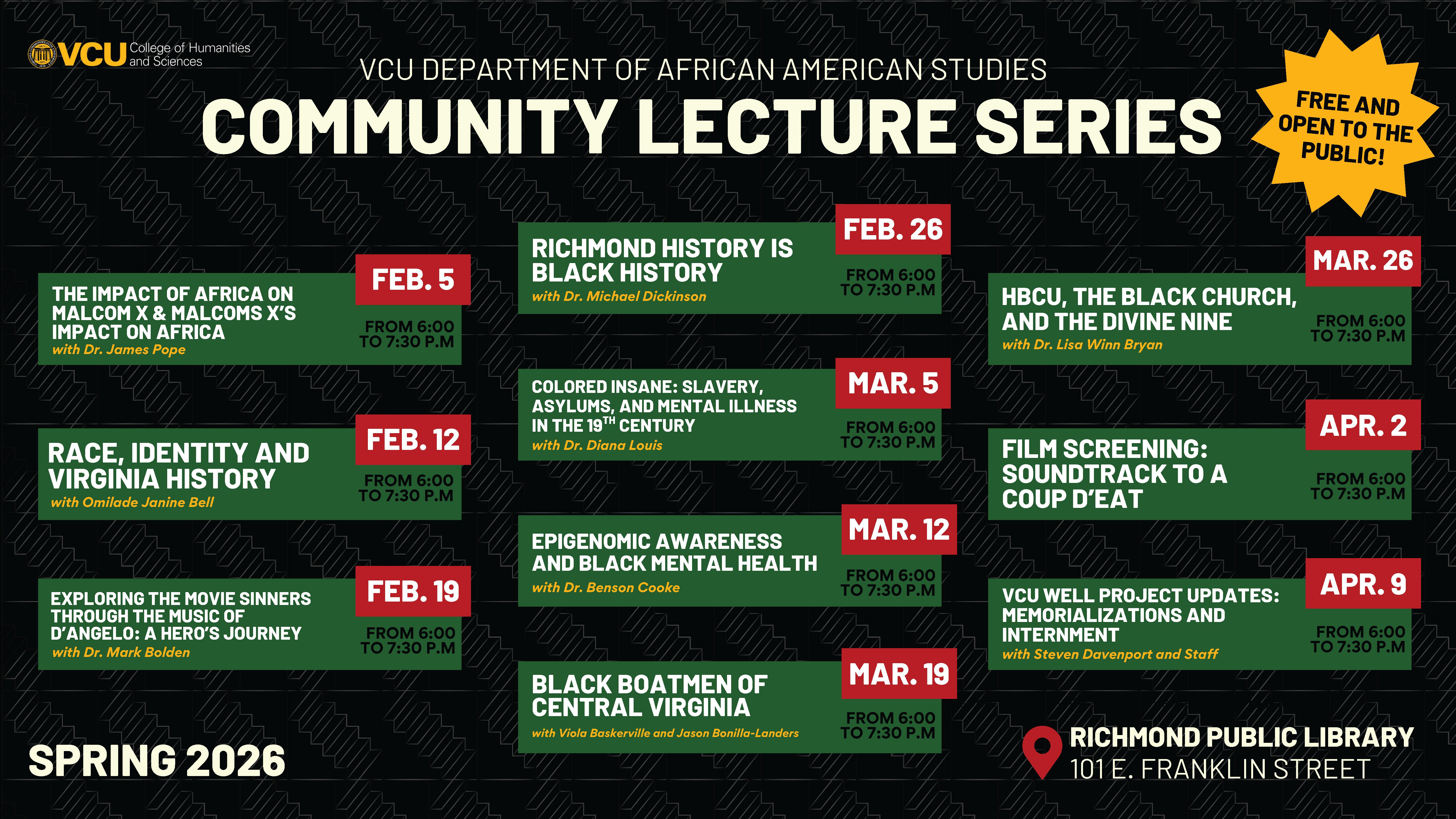 The Department of African American Studies hosts weekly lectures in the Richmond Public Library's Auditorium room, held every Thursday at 6pm. Please view the Community Lecture Calendar for more information! An ADA accessible list of events is available within the AFAM Events Calendar, where all of the department's events are listed.